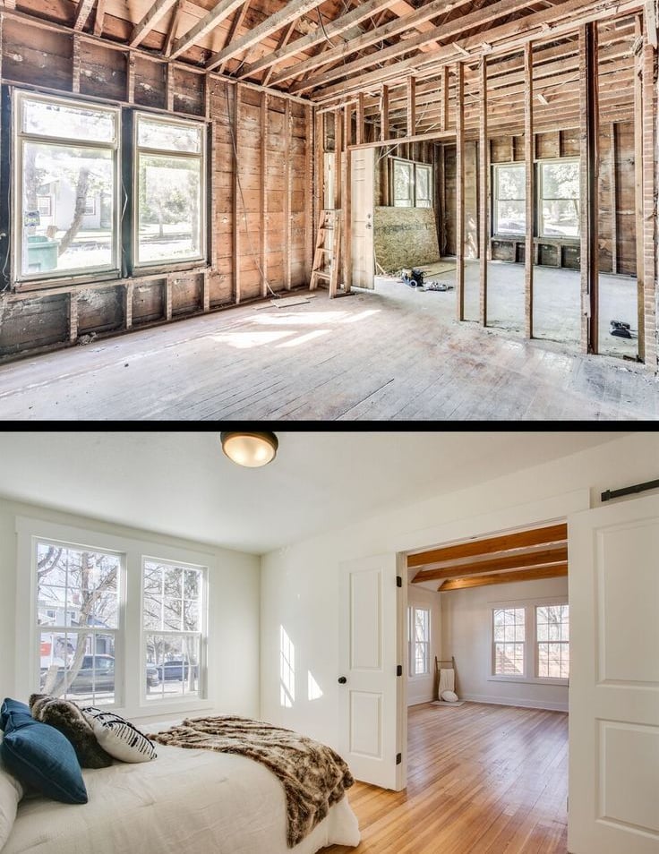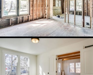 Installation of flooring, moldings, doors, windows, kitchens, fireplace TV.